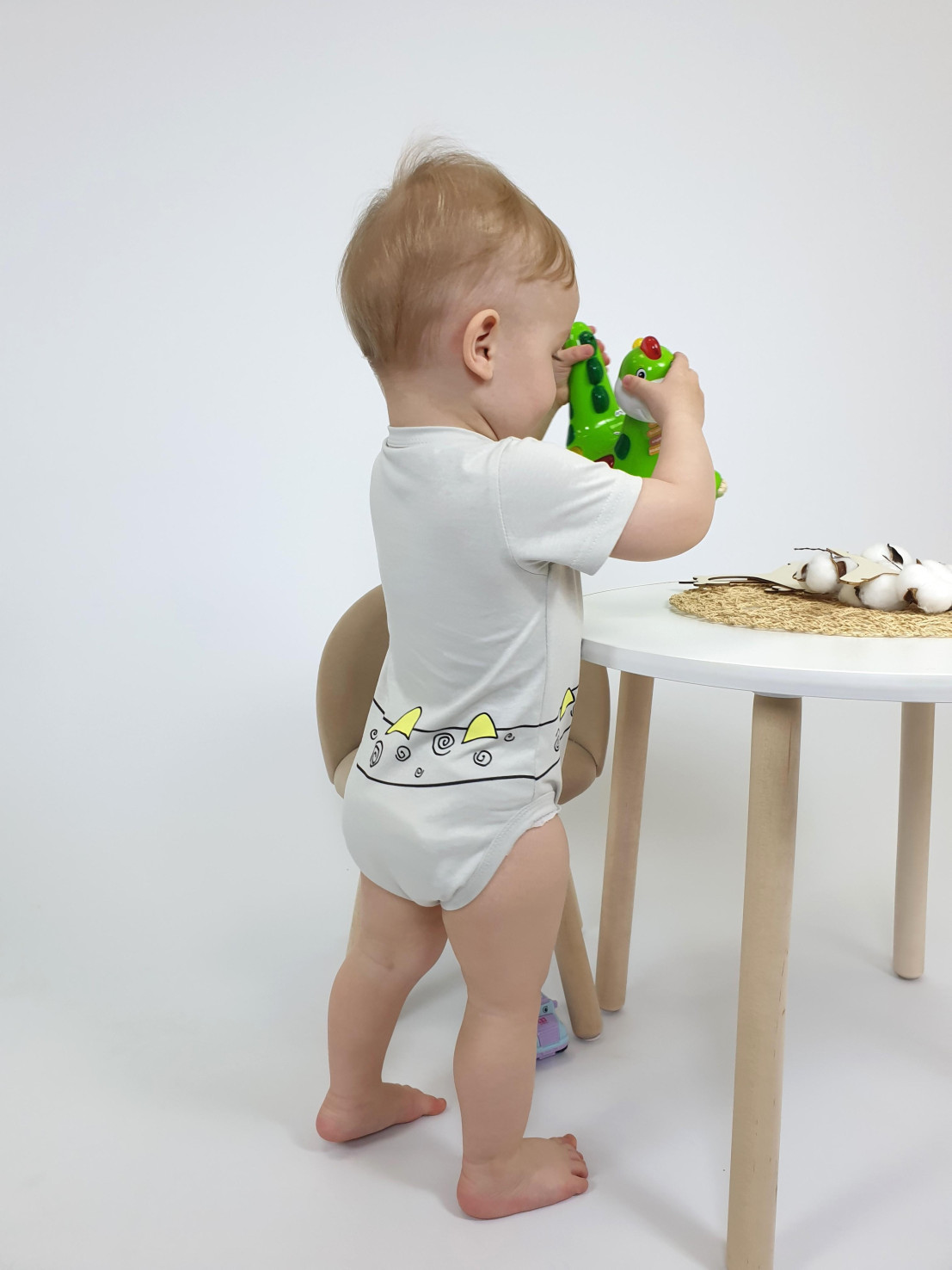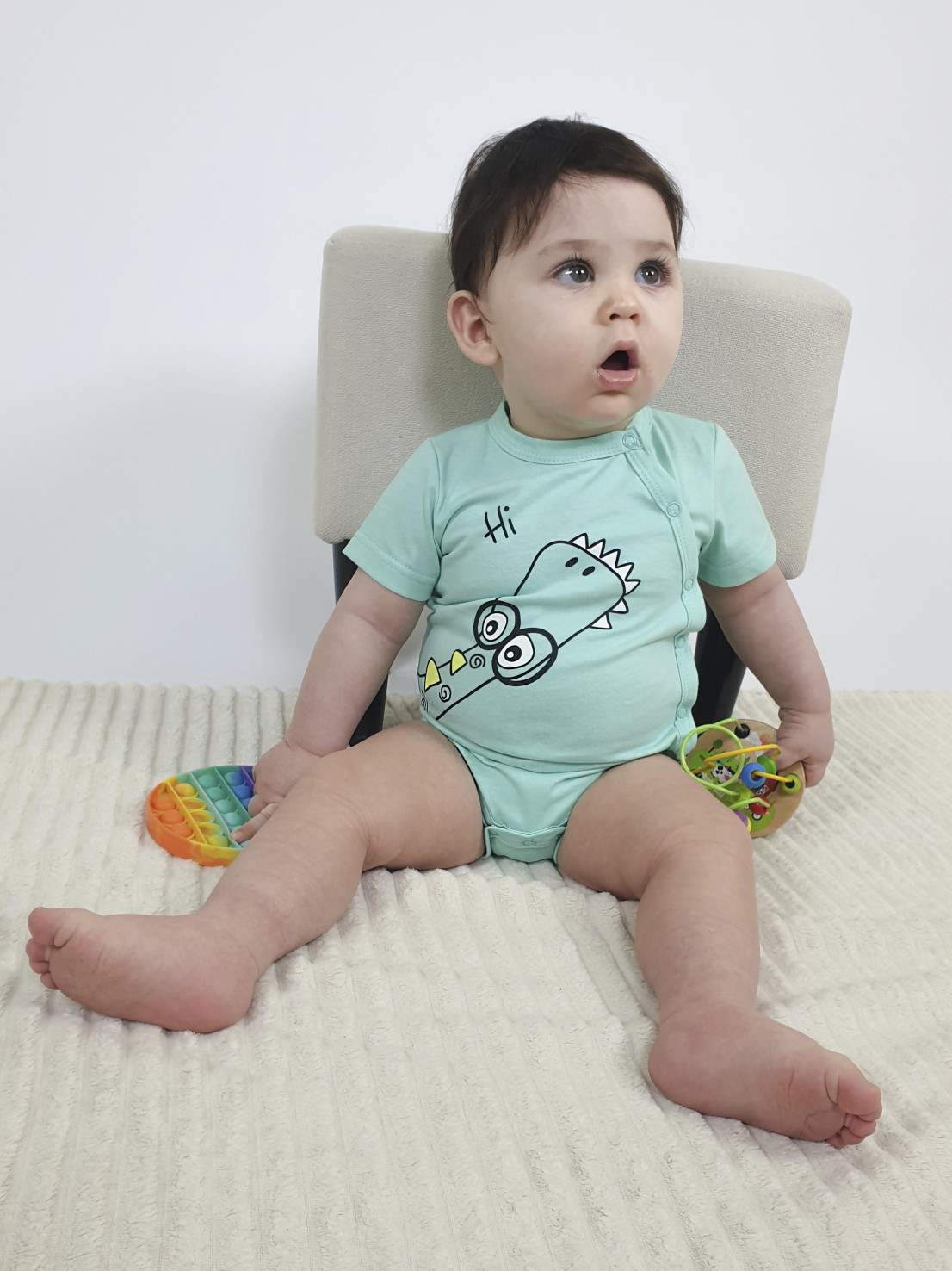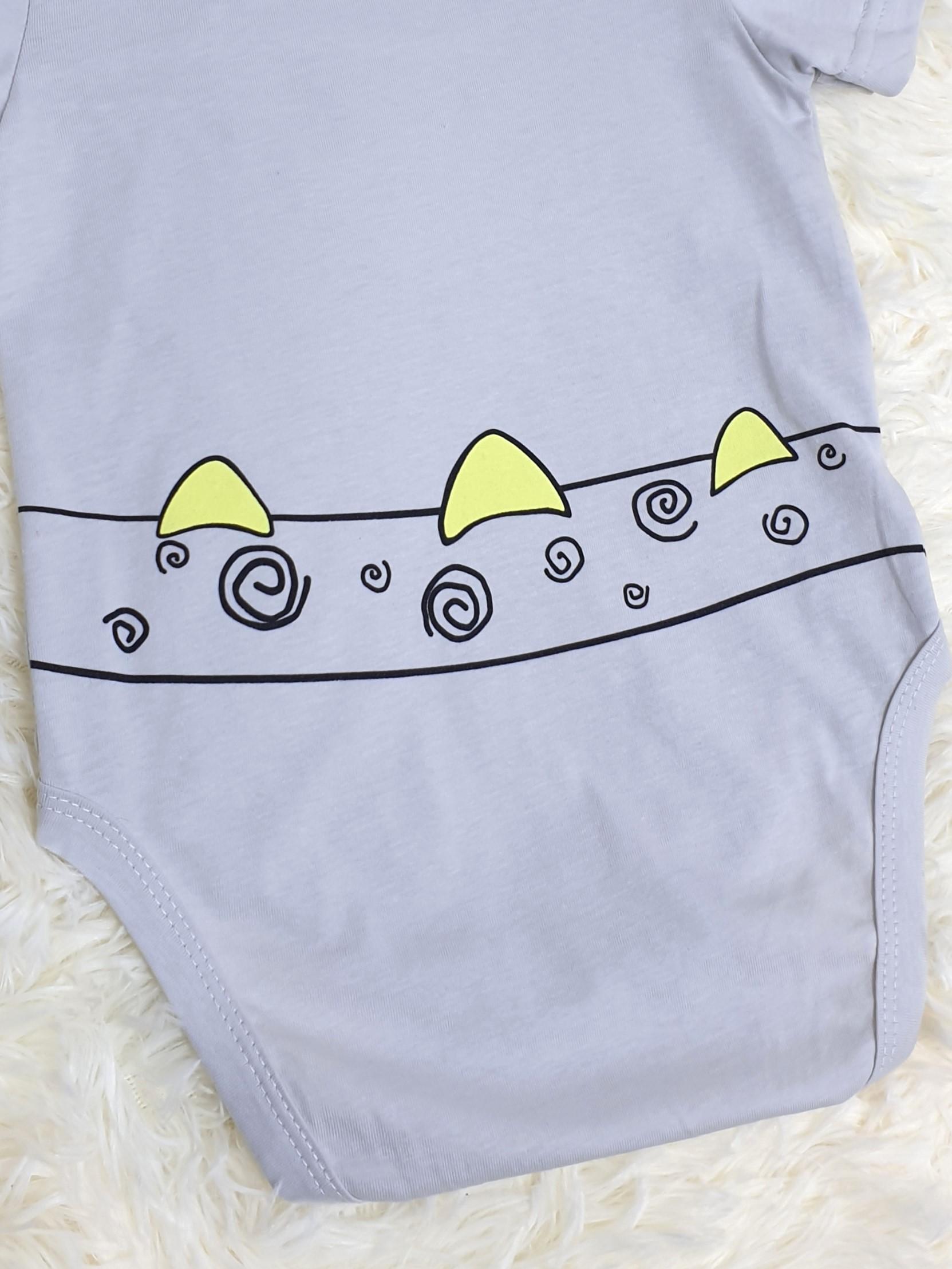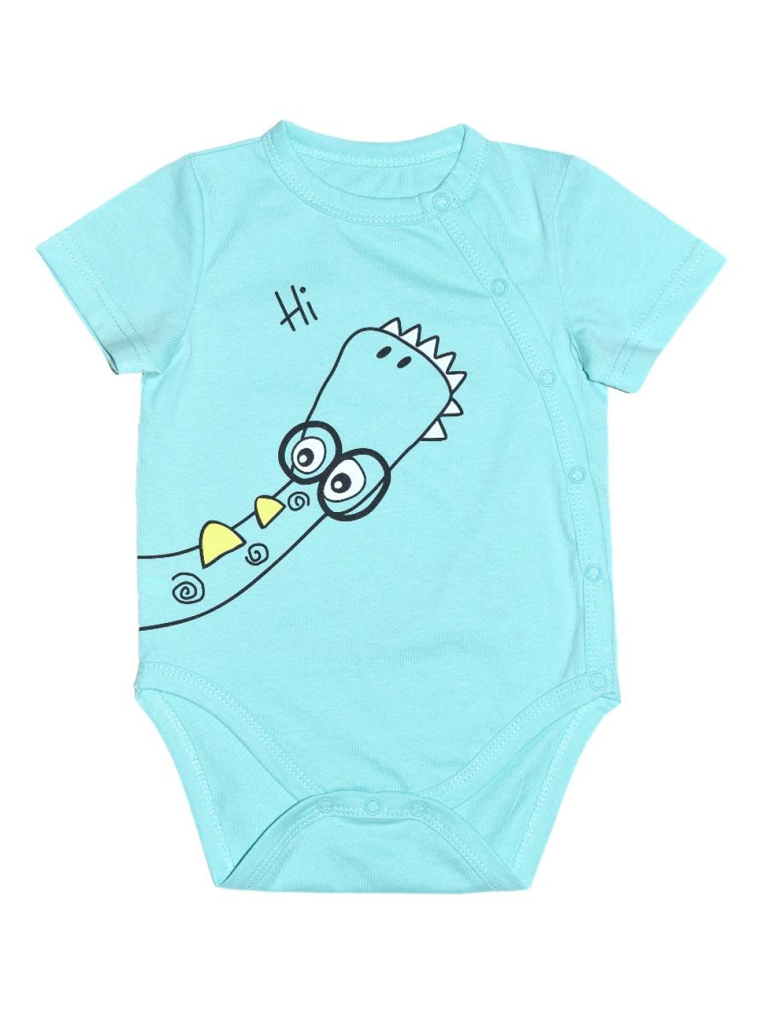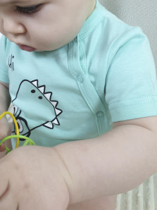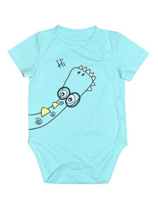 Кулирное полотно:100% х/б. Полукомбинезон(боди)-застежка ассиметричная на переде слева(справа) и по низу изделия на кнопки.Рукав втачной короткий. Перед и спинка с печатью.Горловина,край борта и низ изделия окантованы.