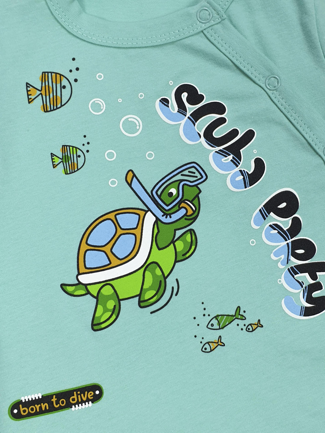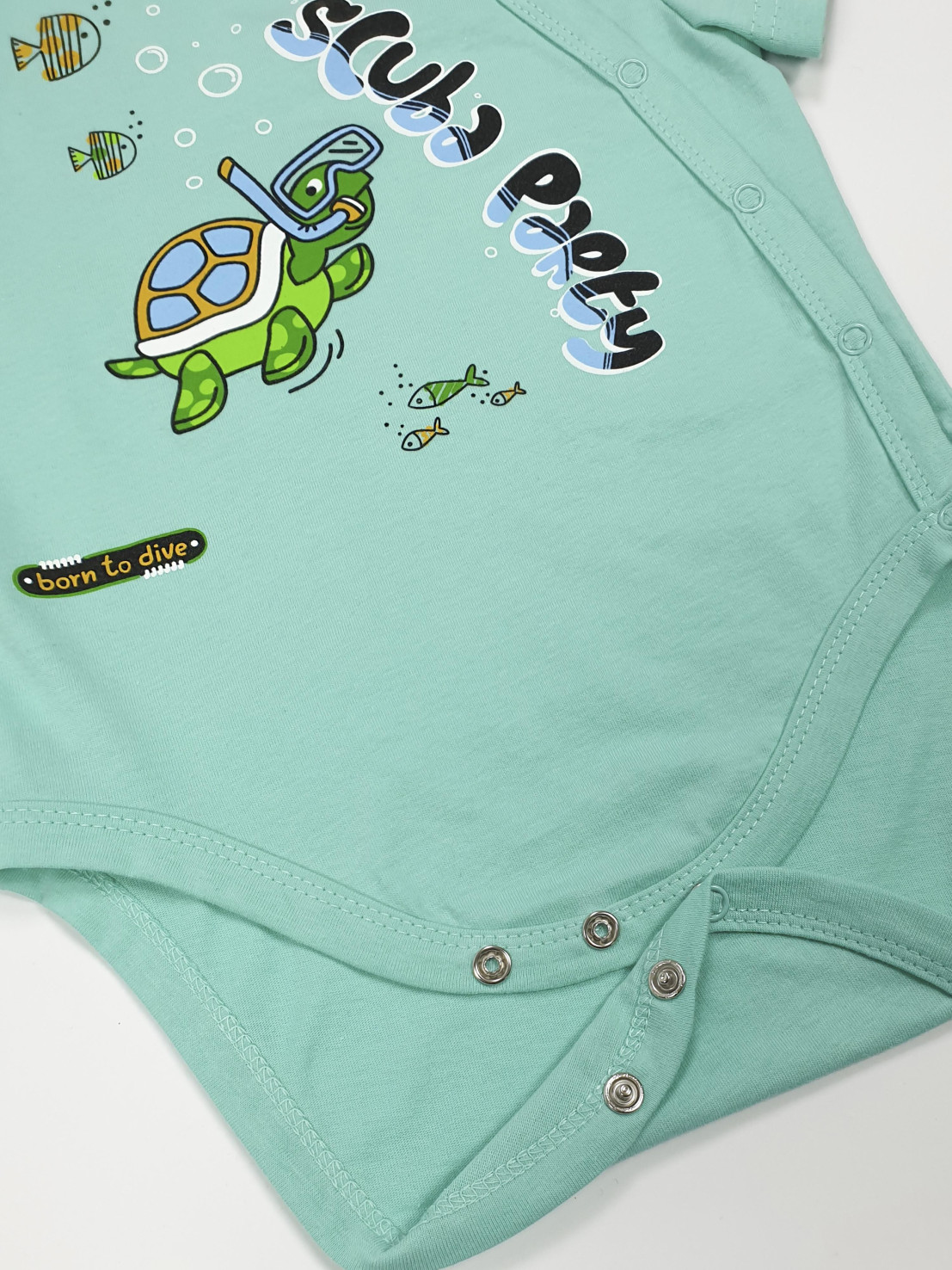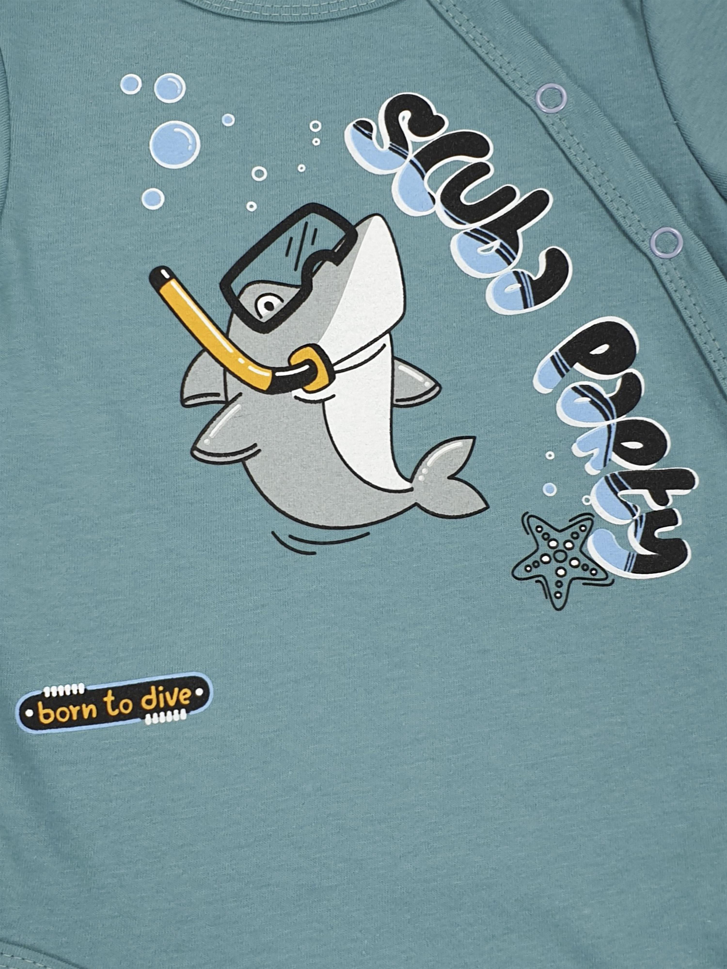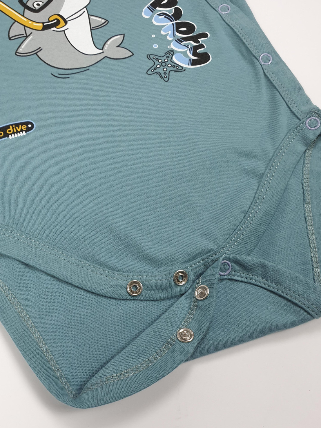 Кулирное полотно:100% х/б. Полукомбинезон(боди)-застежка ассиметричная на переде слева(справа) и по низу изделия на кнопки.Рукав втачной короткий. Перед с печатью.Горловина,край борта и низ изделия окантованы.