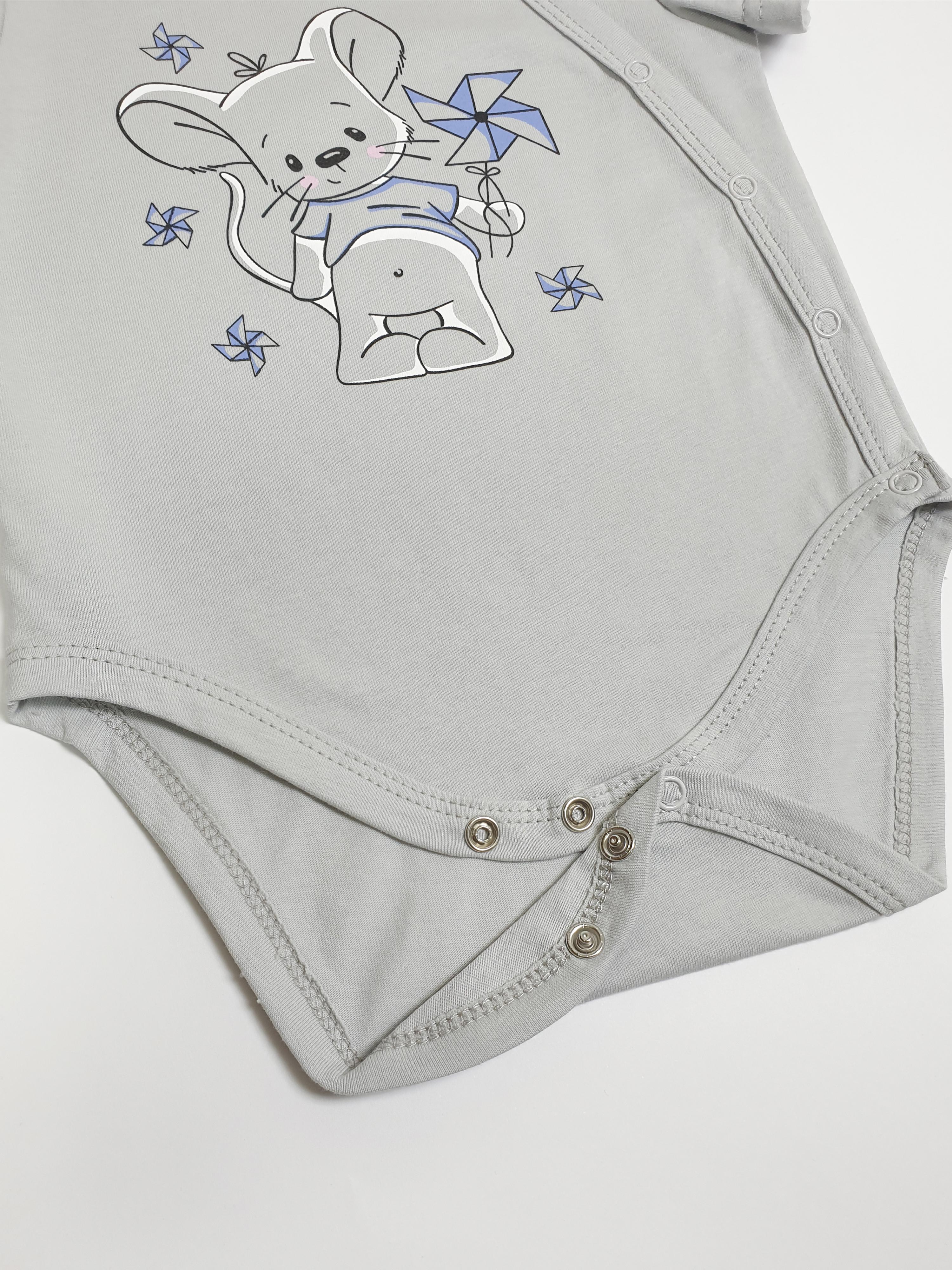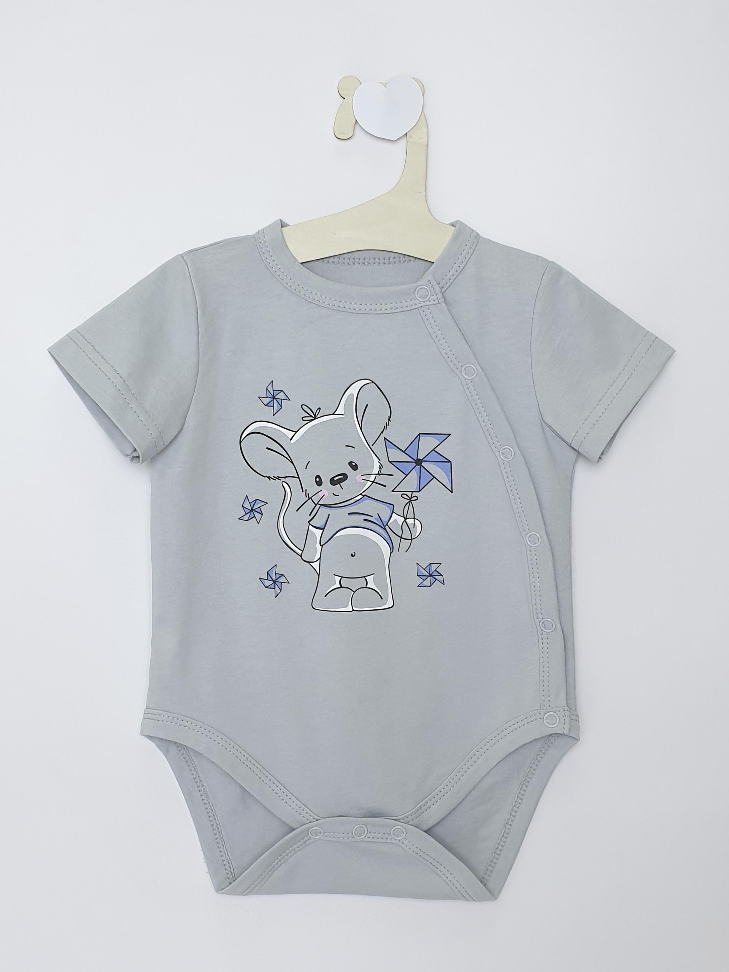 Кулирное полотно:100% х/б. Полукомбинезон(боди)-застежка ассиметричная на переде слева(справа) и по низу изделия на кнопки.Рукав втачной короткий. Перед с печатью.Горловина,край борта и низ изделия окантованы.