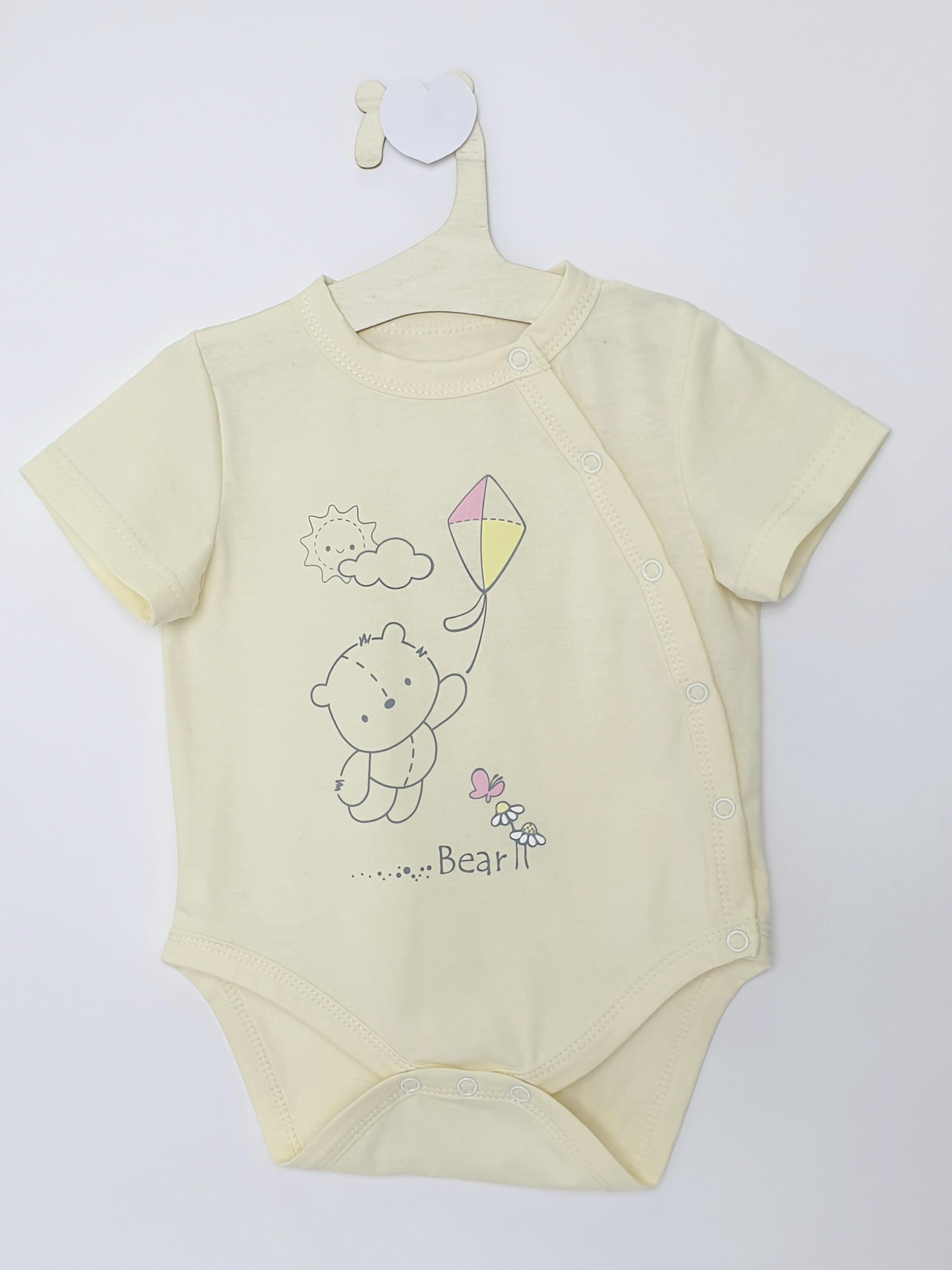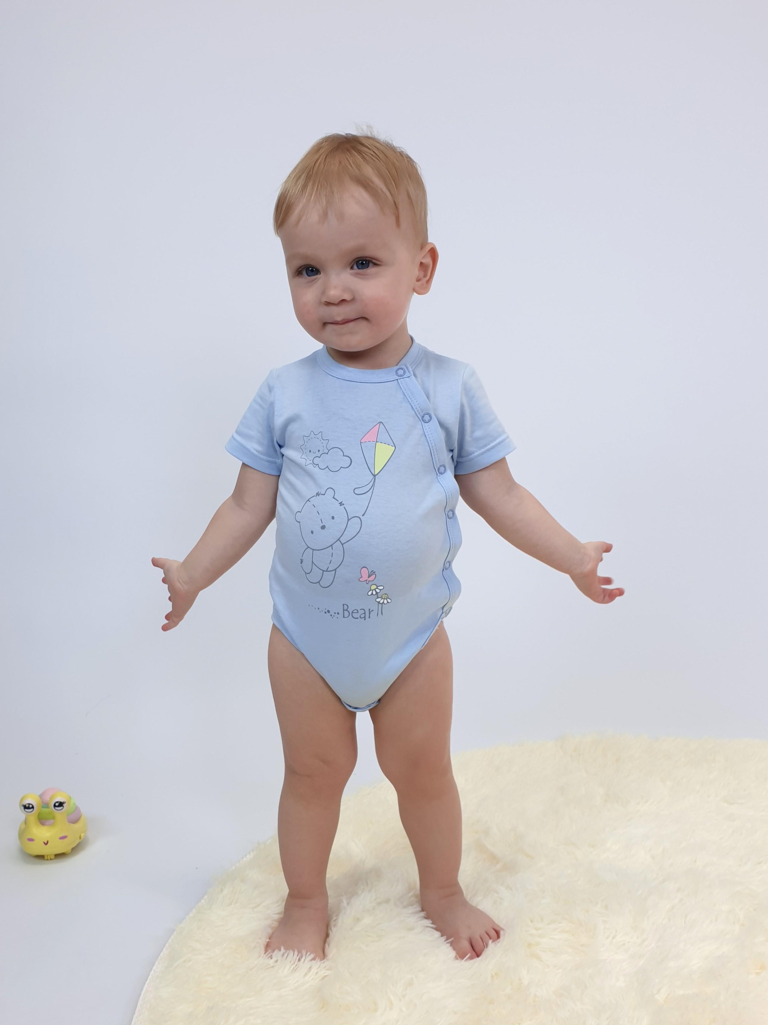 Кулирное полотно:100% х/б. Полукомбинезон(боди)-застежка ассиметричная на переде слева(справа) и по низу изделия на кнопки.Рукав втачной короткий. Перед с печатью.Горловина,край борта и низ изделия окантованы.