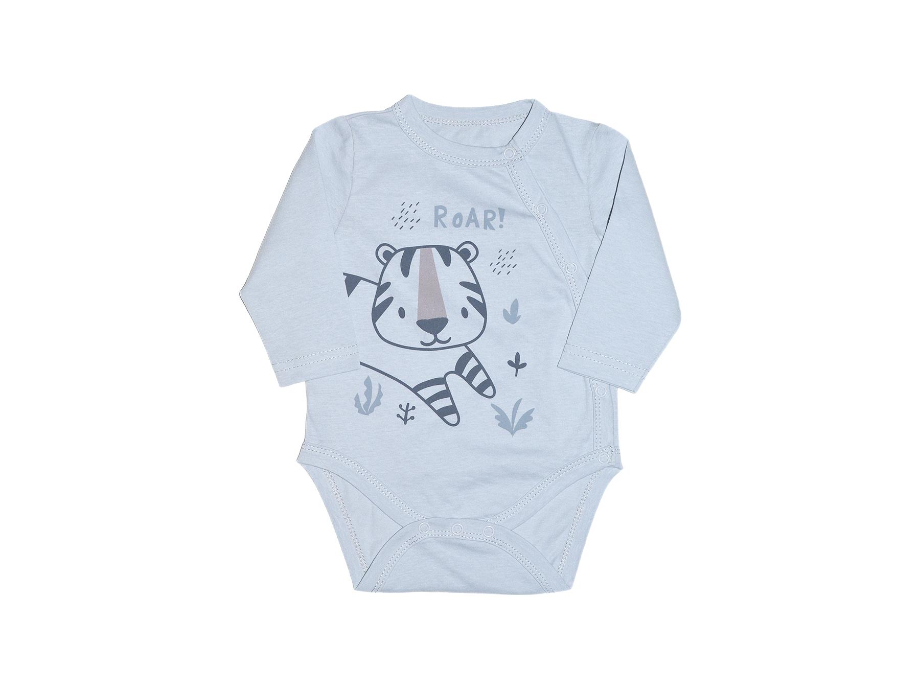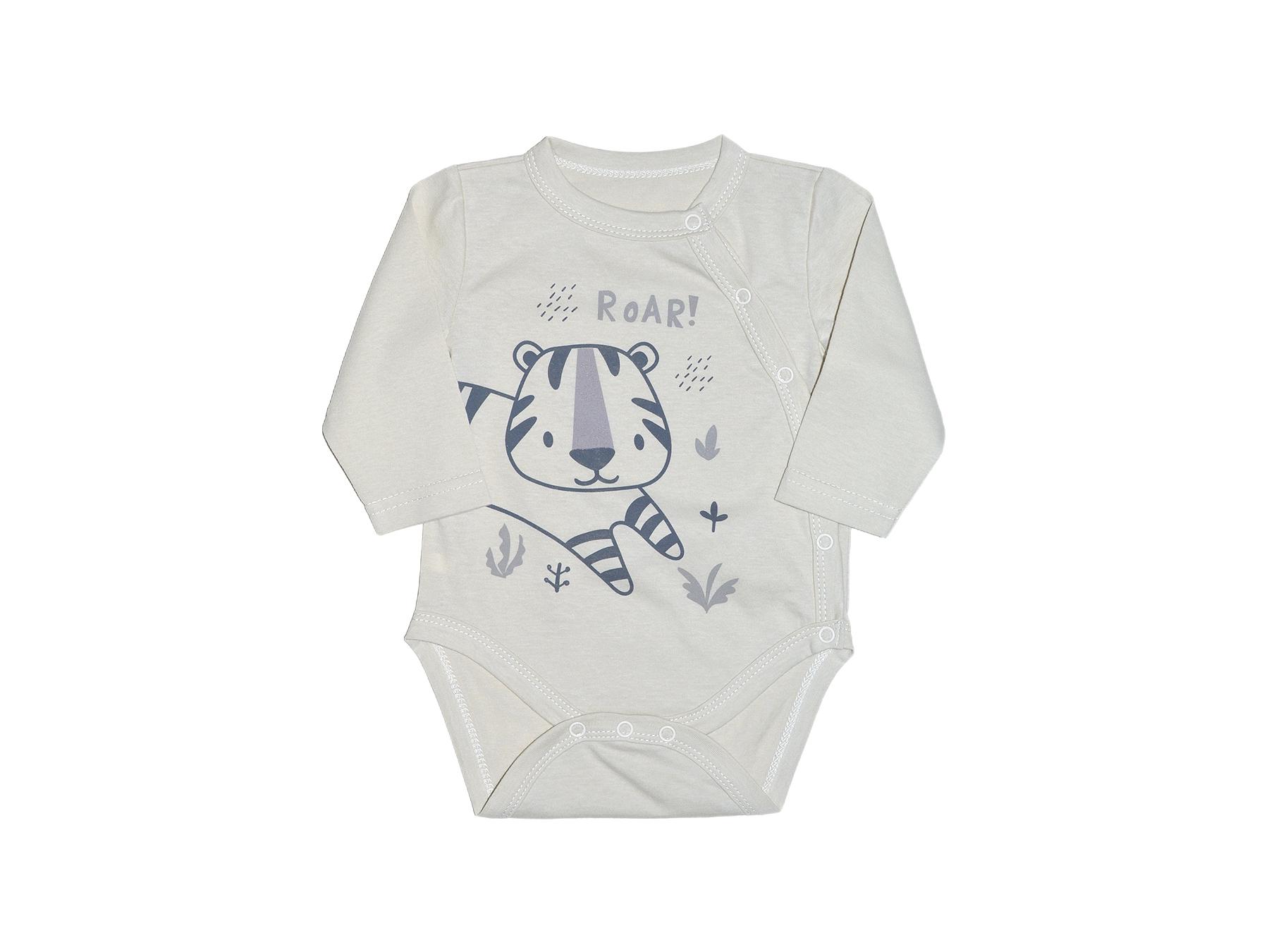 Кулирное полотно: 100% х/б. Полукомбинезон (боди)-застежка ассиметричная на переде слева(справа) и по низу изделия на кнопки. Рукав втачной длинный,печать по переду.Горловина, край борта и низ изделия- окантованы.