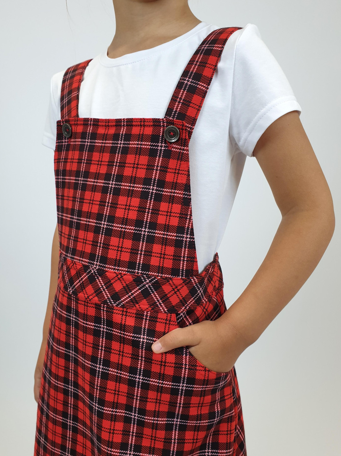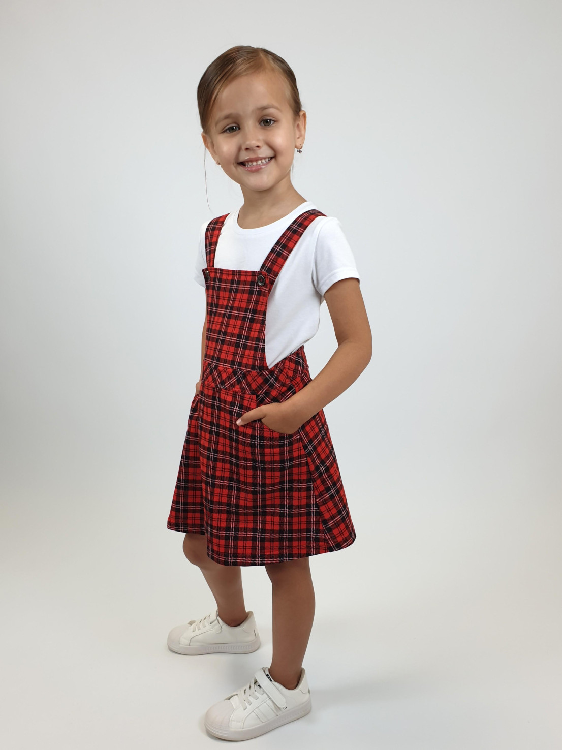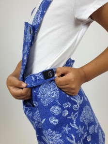 Футер: 2-х нитка 75% х/б, 25% п/э. Сарафан-отрезная кокетка на подкладке.Юбка с двумя карманами.Лямки пристегиваются на пуговицы и кокетке.Сзади на поясе регулирующая резинка.