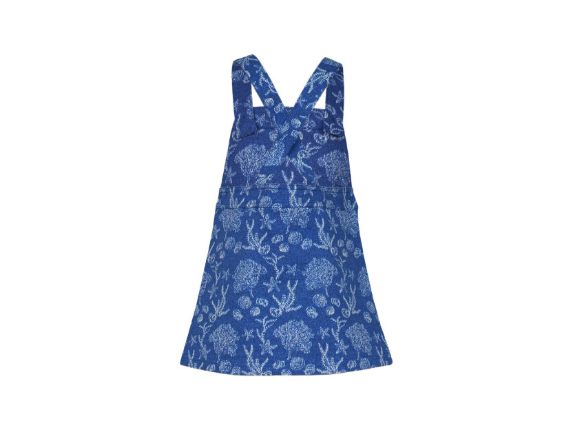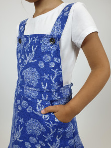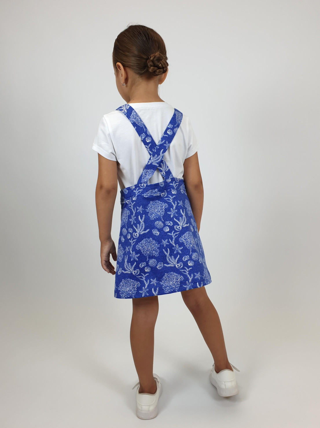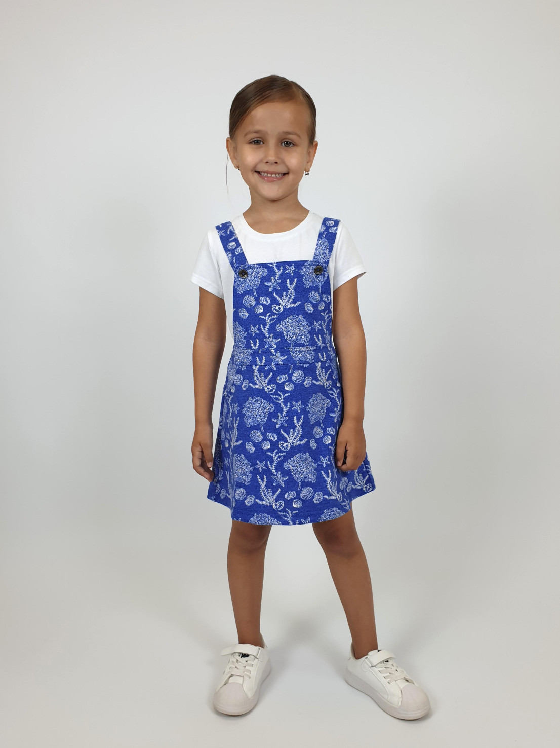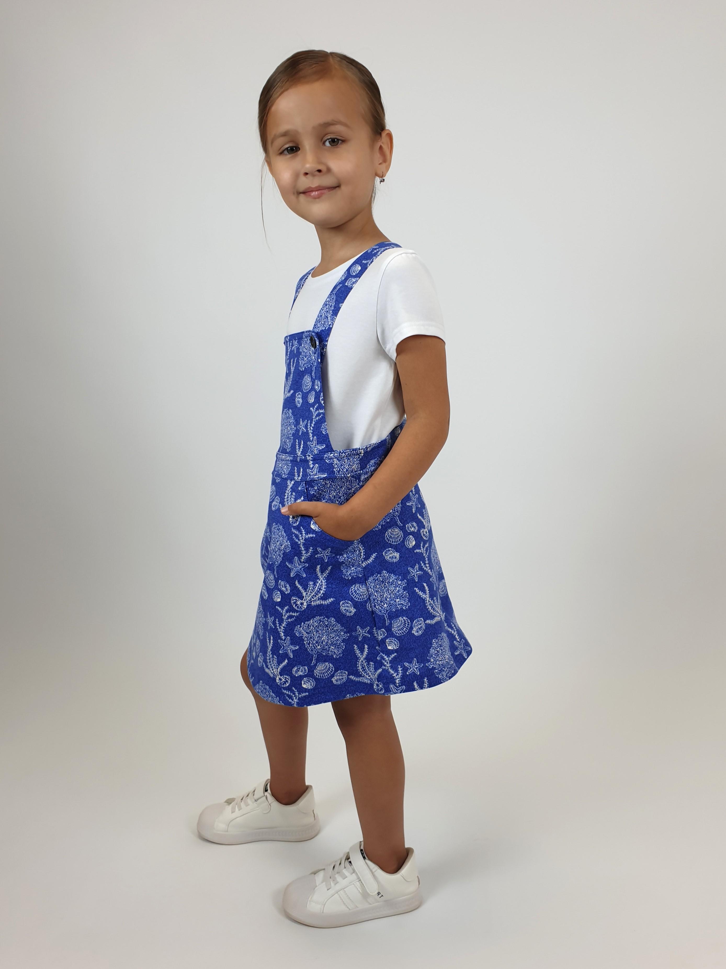 Футер: 2-х нитка 75% х/б, 25% п/э. Сарафан-отрезная кокетка на подкладке.Юбка с двумя карманами.Лямки пристегиваются на пуговицы и кокетке.Сзади на поясе регулирующая резинка.