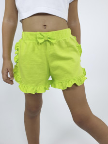 Шорты. Кулирное полотно, 100% х/б. Шорты-короткие с рюшей по боковым швам и низу. Притачной пояс с резинкой и отделочным бантом.