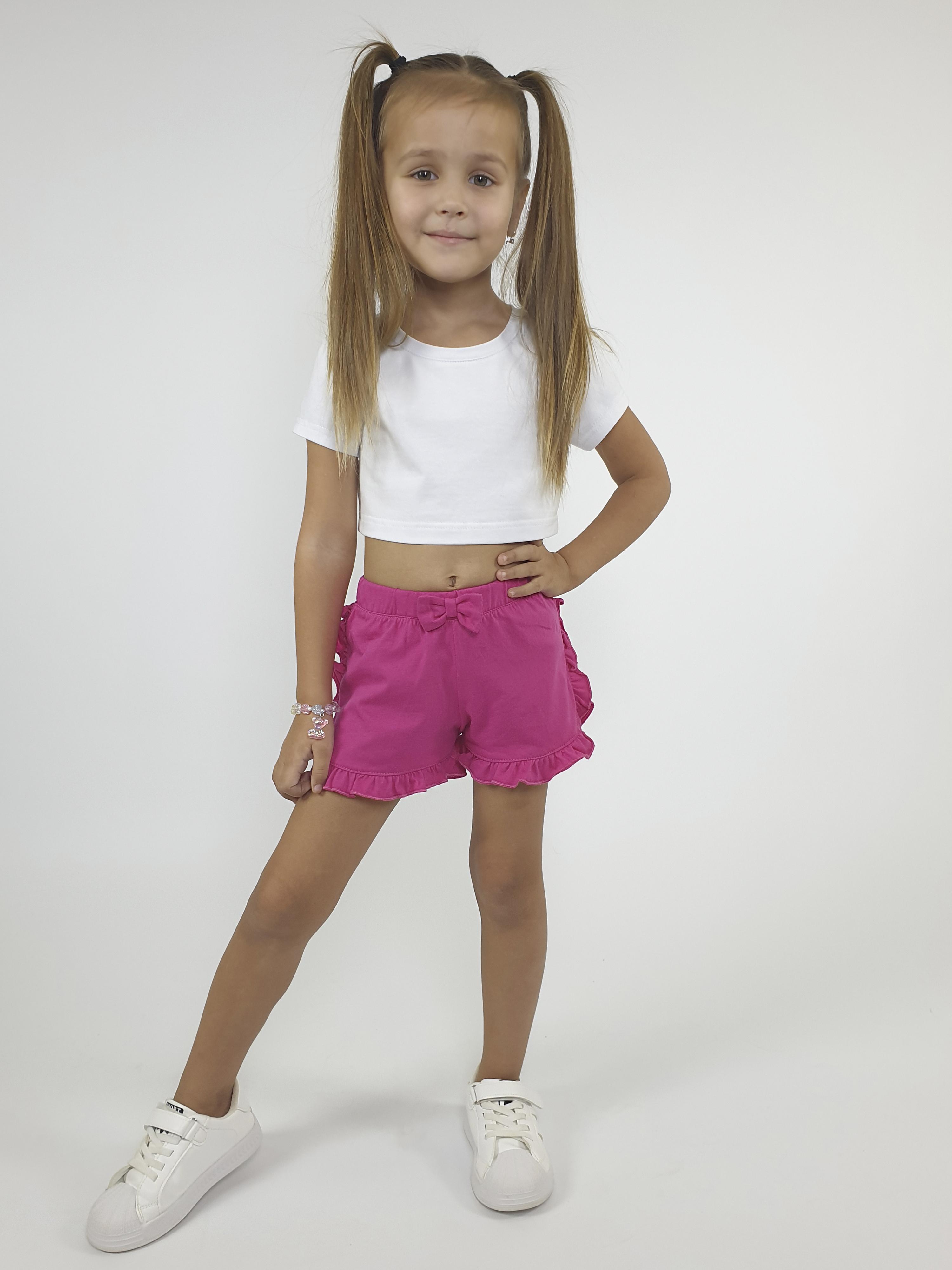 Шорты. Кулирное полотно, 100% х/б. Шорты-короткие с рюшей по боковым швам и низу. Притачной пояс с резинкой и отделочным бантом.