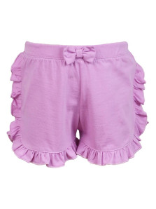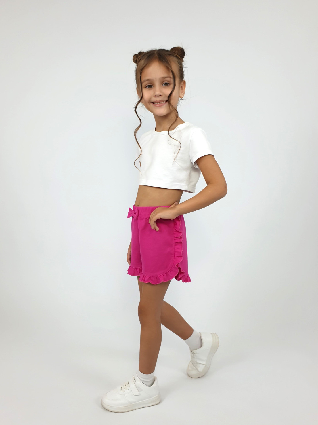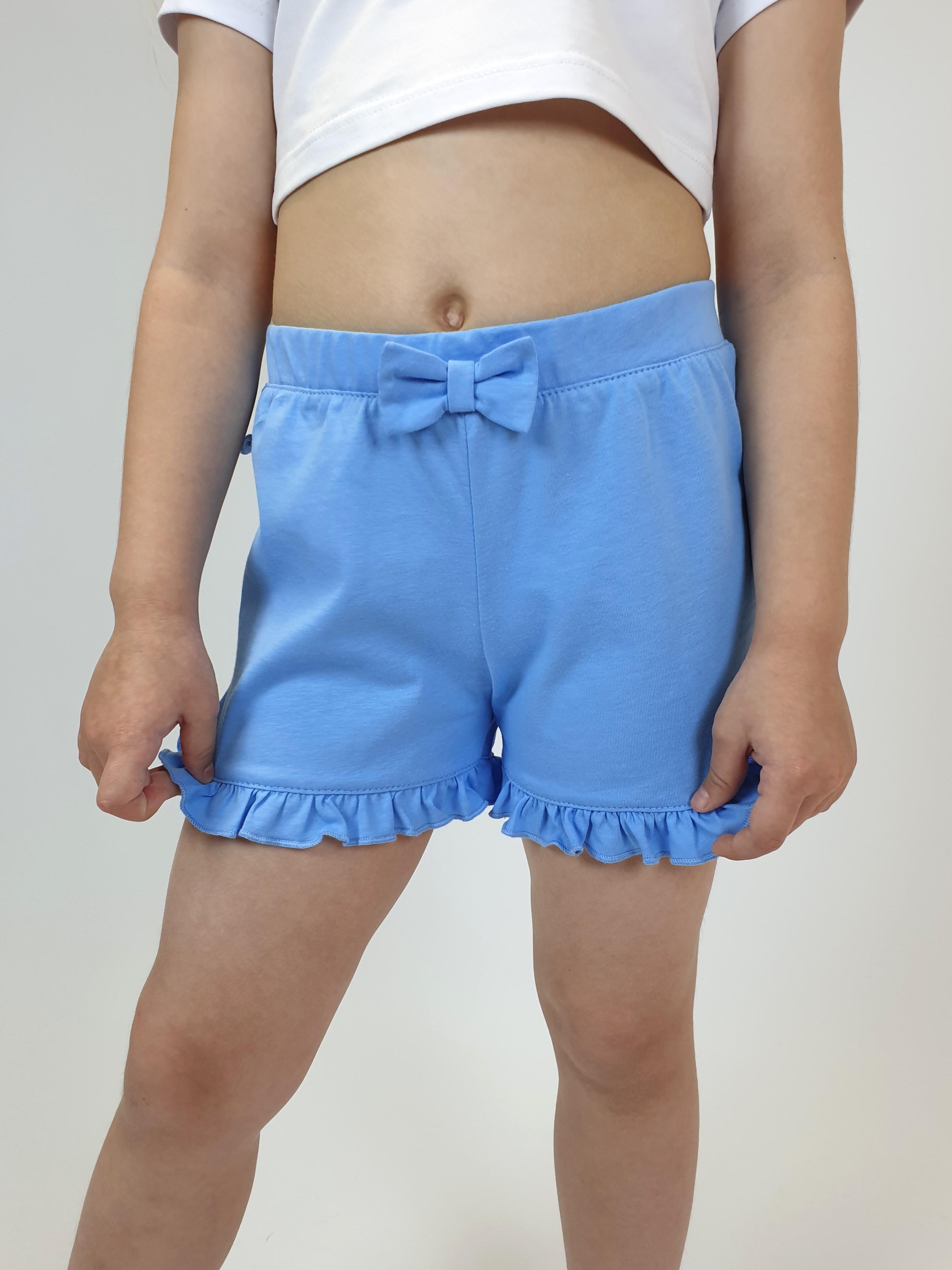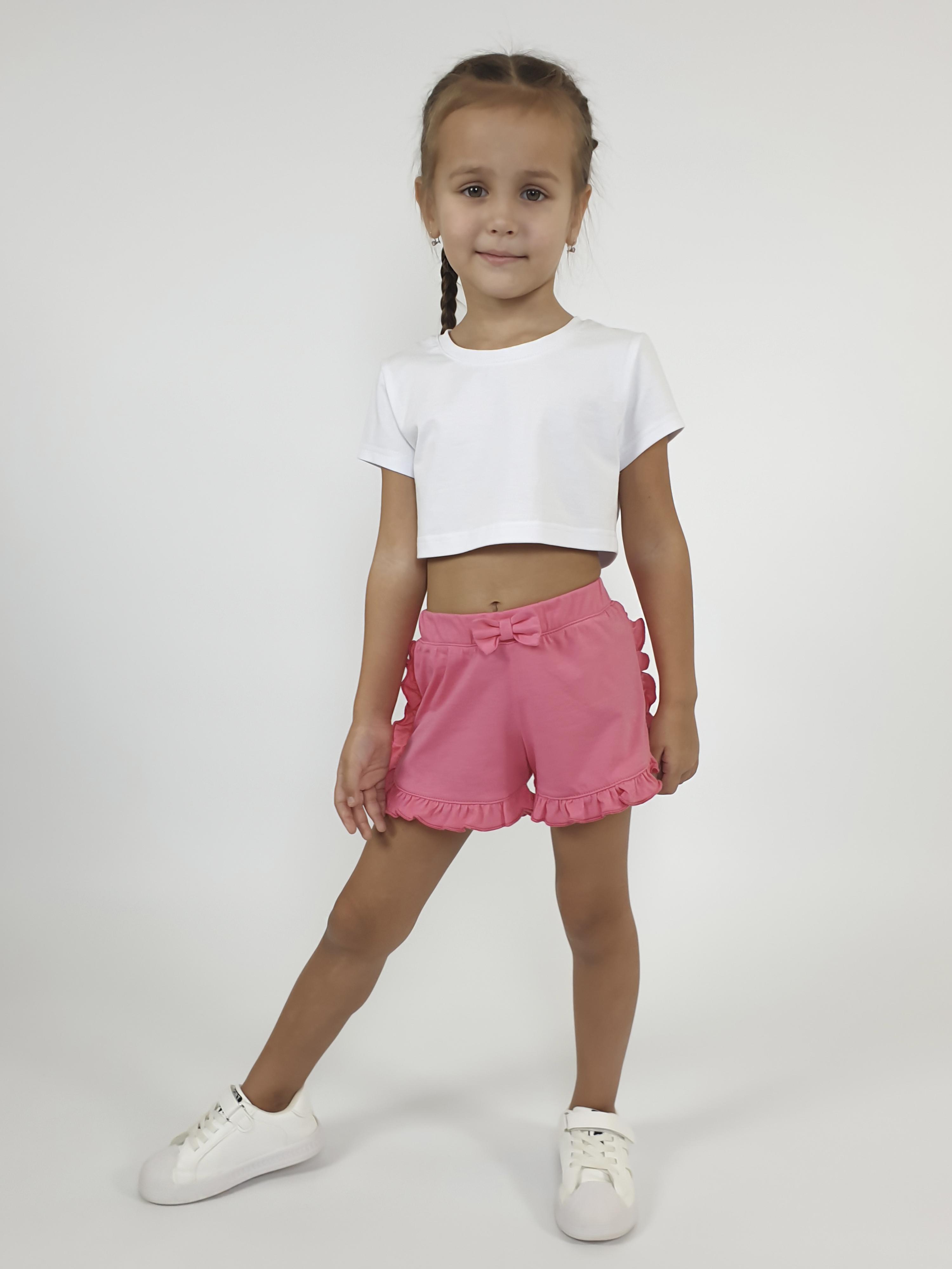 Шорты. Кулирное полотно, 100% х/б. Шорты-короткие с рюшей по боковым швам и низу. Притачной пояс с резинкой и отделочным бантом.