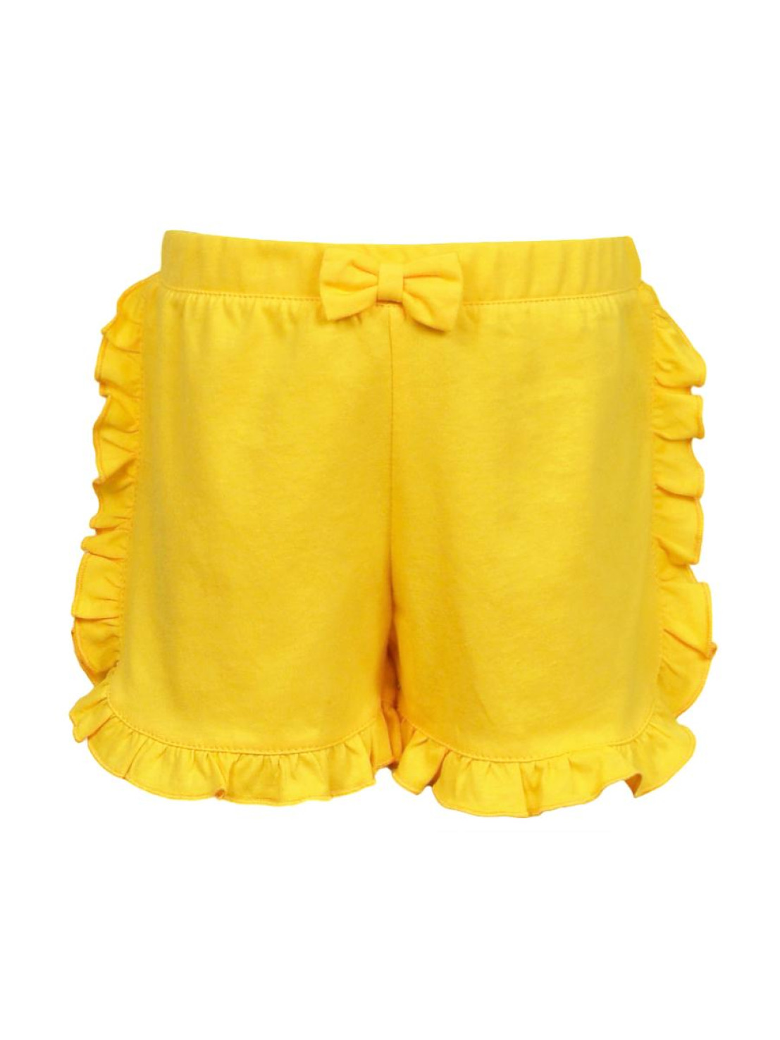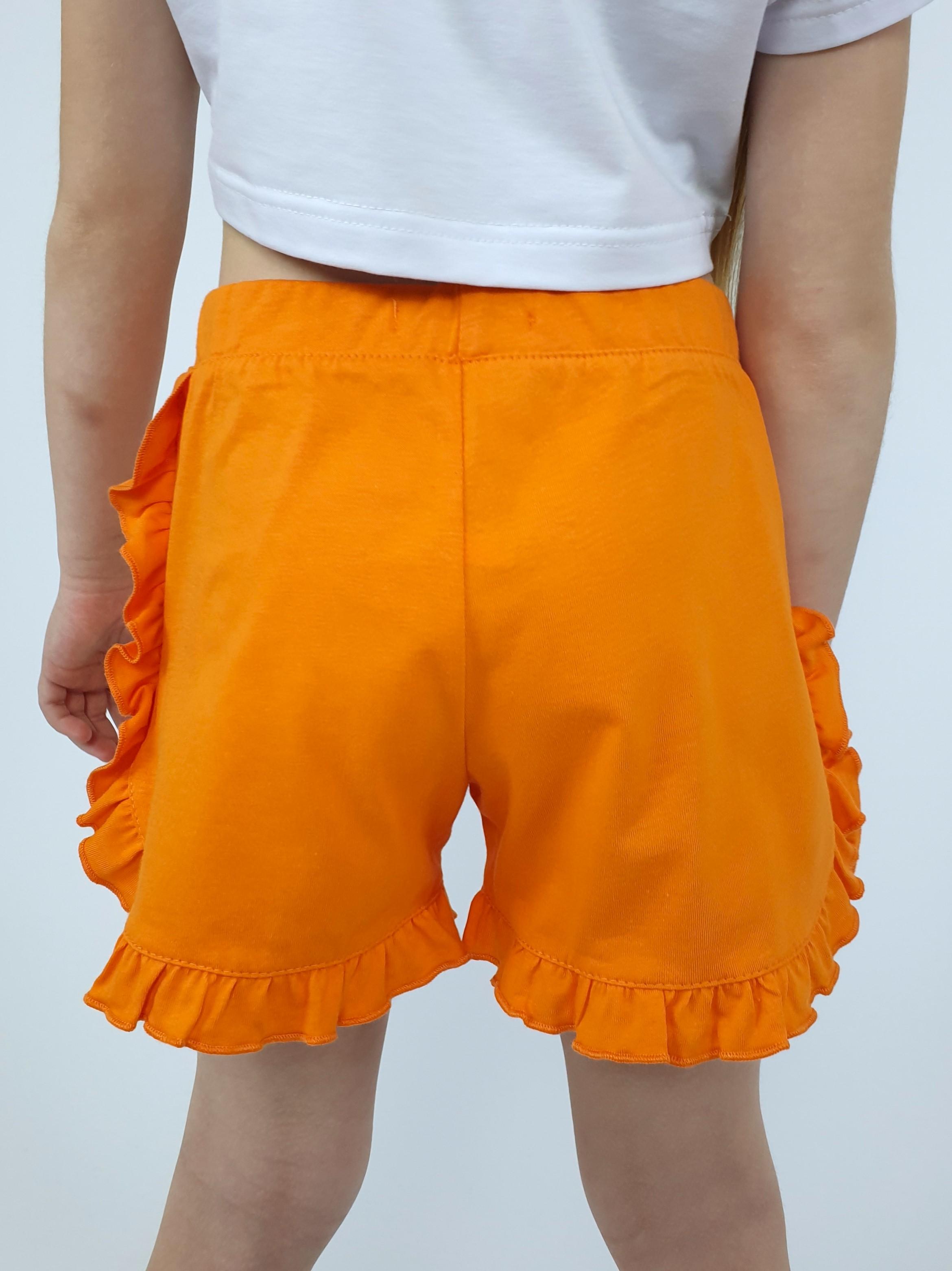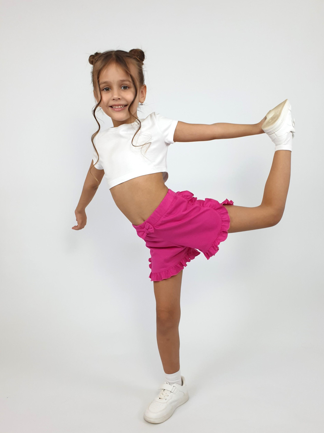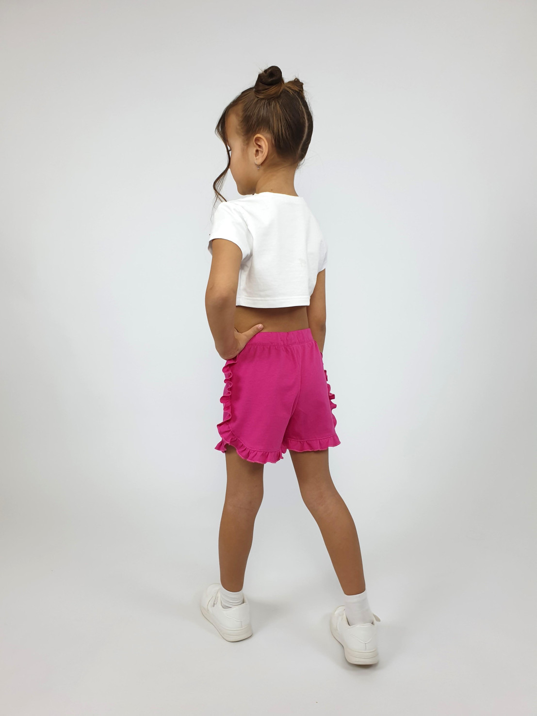 Шорты. Кулирное полотно, 100% х/б. Шорты-короткие с рюшей по боковым швам и низу. Притачной пояс с резинкой и отделочным бантом.