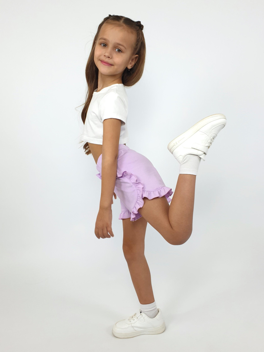 Шорты. Кулирное полотно, 100% х/б. Шорты-короткие с рюшей по боковым швам и низу. Притачной пояс с резинкой и отделочным бантом.