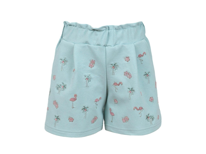 Футер двух нитка:80% х/б,14% п/э,6% лайкра. Шорты-короткие на поясе с резинкой,с мягкими складками.перед с вышивкой и двумя карманами.